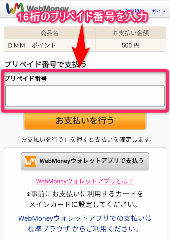 WebMoneyのページに遷移します。WebMoneyのプリペイド番号を入力してください。